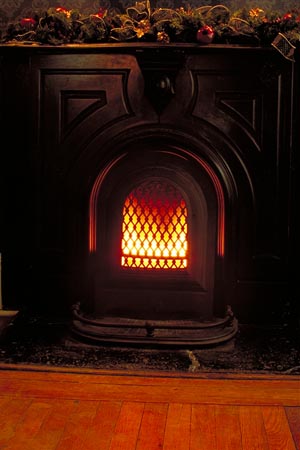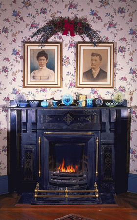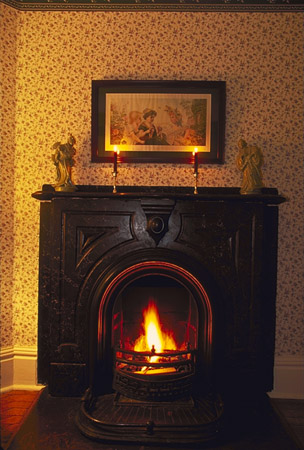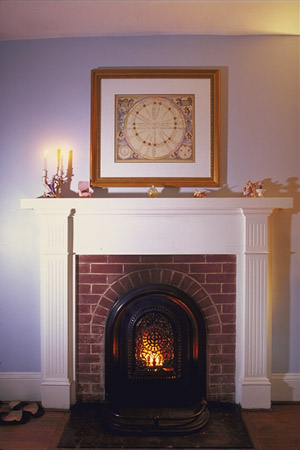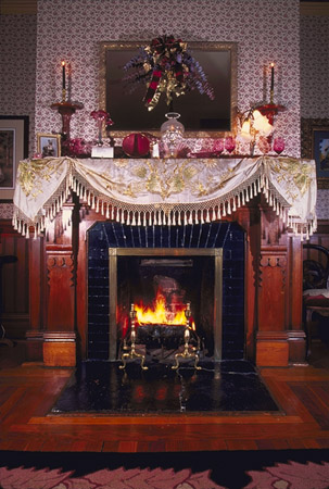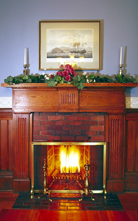 The eight original fireplaces of Elmwood were built and installed for heating this luxurious home. Now with hot water heat running through heavy and decorative cast iron radiators, these lovely fireplaces are welcome heat supplements but mostly provide atmosphere throughout the house. All of them work and three are available as private fireplaces in the suites. [In addition there are two Dimplex electric fireplaces which were added for atmosphere in Rosa’s Room and the Nurse’s Room during the 1997 renovations.] The first floor public rooms had four fireplaces, the second floor had three and the third floor for the servants had but one. Architect William Harris’ house design specified that there would be natural grained wood only in the vestibule and the first and second floor reception halls. These two rooms therefore have the oak mantles and surrounds for their fireplaces. The second floor reception hall is now the Inn’s Common Room for the guests. There are four (three shown here) black grained faux marble mantles found in the Library, Parlour (now our Family Room), Dining Room and the Premier’s Suite. The unique fireplace in the Cunard Suite has a shelf mantle and a plaster front with a tole painted tulip motif painted by Island artist, Lorraine Quinn. There is one painted wood surround, the only original fireplace on the third floor which had been the servants’ quarters. It is in the Peake Suite. We guess that the staff were expected to benefit from the rising heat from the family rooms below.