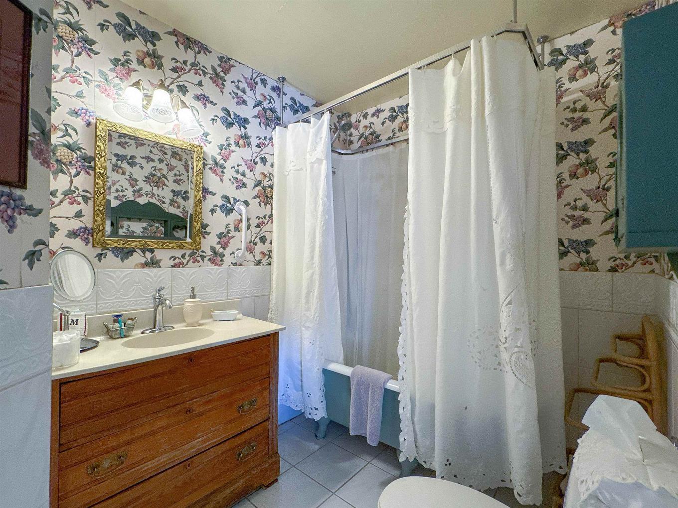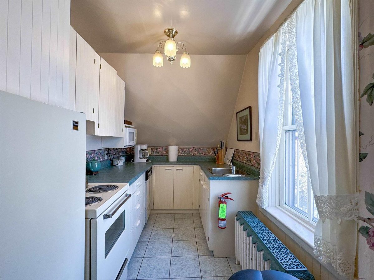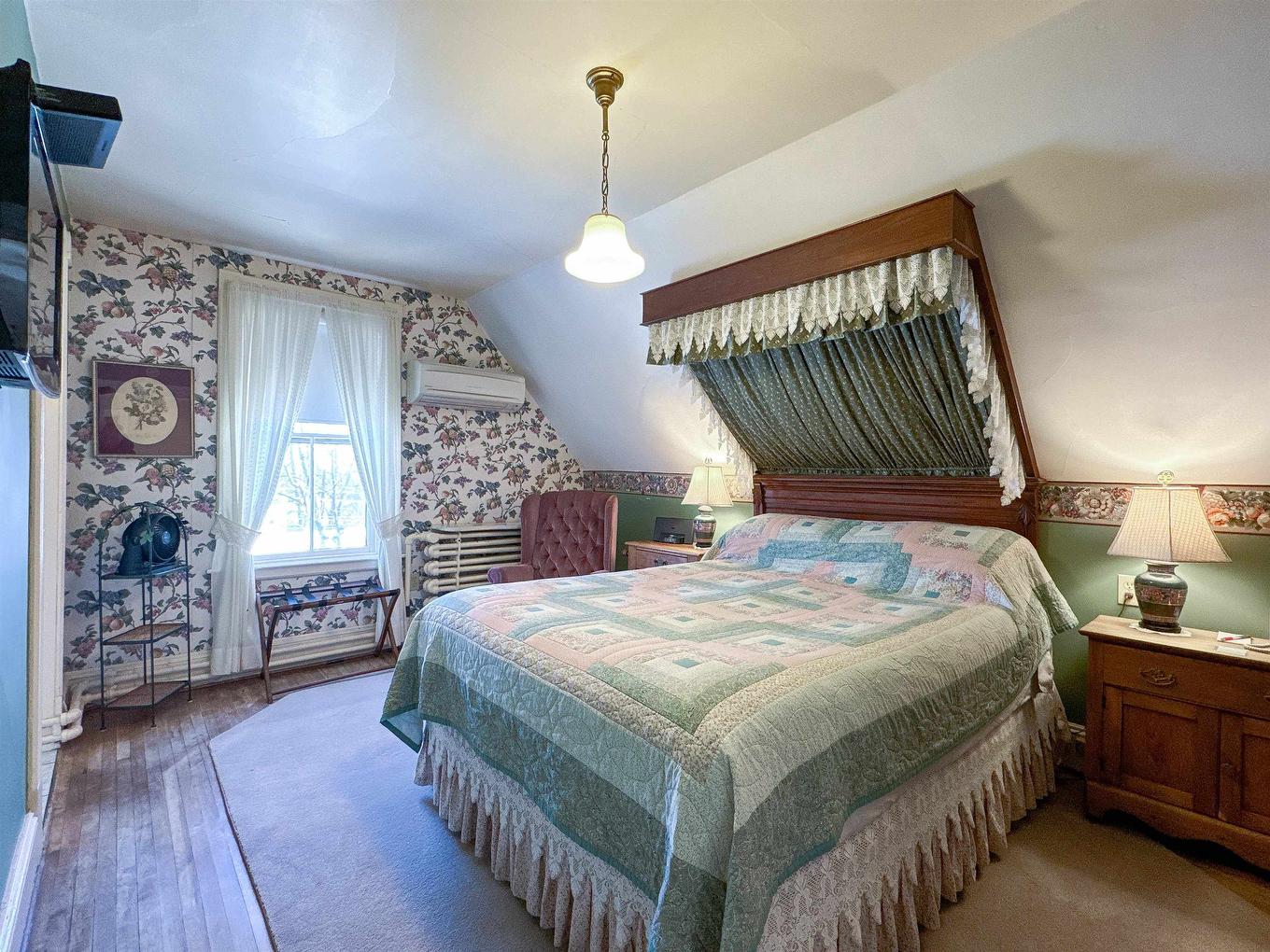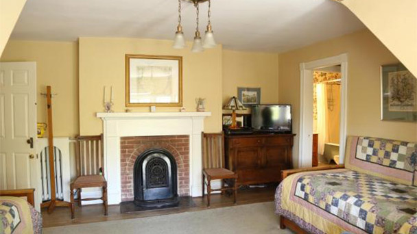 A private secluded roomy garret living room with a three-sided Halifax dormer, twin oak Mission beds flanking the original working fireplace as day bed sofas, Flat Screen TV with DVD/VCR. The bedroom has a queen bed with angled canopy and a second Flat Screen TV, iPod dock clock radio/cd and there is a small galley kitchen with Coffee maker, tea pot & kettle, fridge, stove, dishes and utensils, dishwasher and microwave. Broadloom over the hardwood floors, footed Victorian soaking tub with shower in the private bath. Oak and pine predominate. Sleeps up to four. A full Suite for the price of a room!