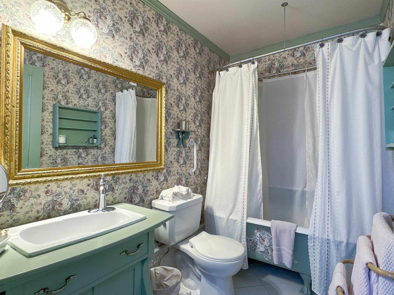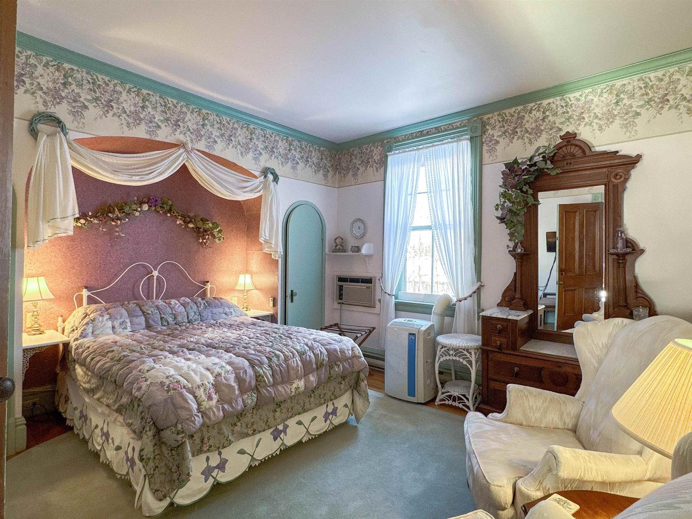 An inviting room with shallow queen bed alcove, modest seating area with a pair of wing backs and coffee table, a broadloom area rug over the hardwood floor, an outstanding 1800′s marble top step dresser with tall mirrored back and candle stands, walnut decor, footed soaking tub with shower in the private bath.